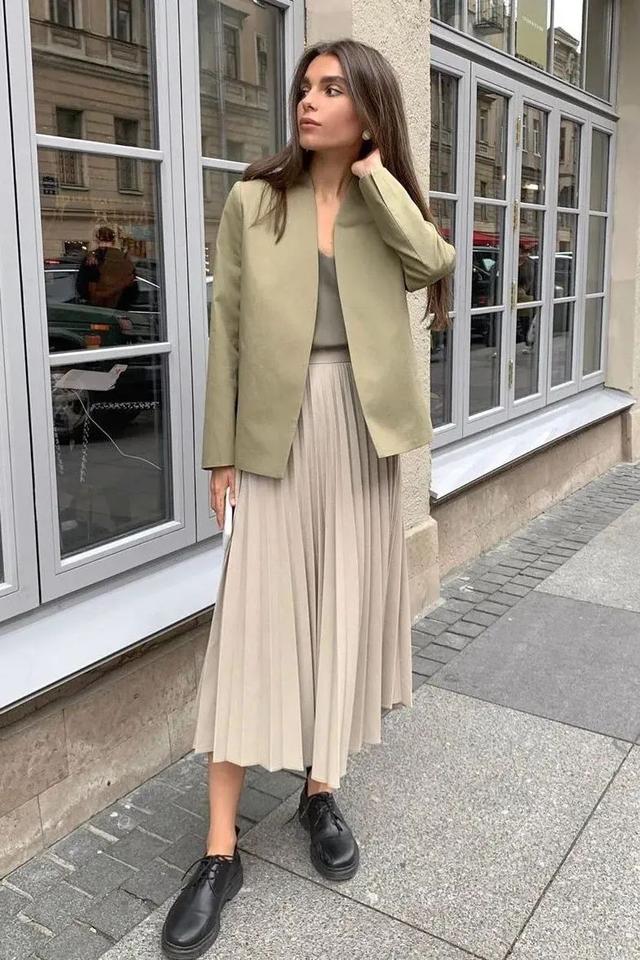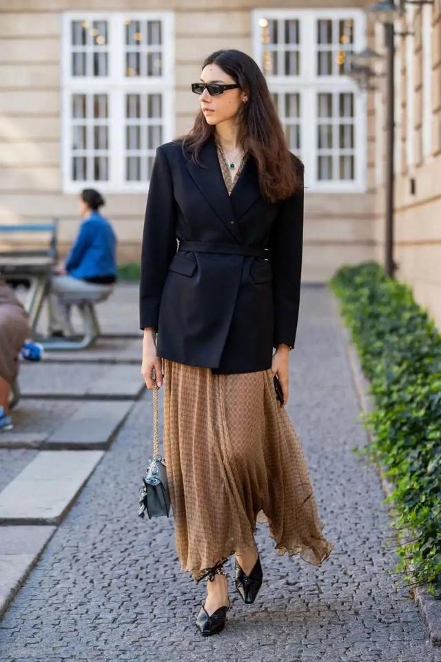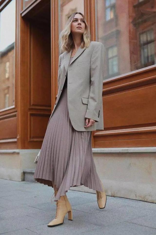 春天最常见的还属西服+百褶裙,不仅可以轻松藏肉于无形,还能借助翩翩裙摆将造型层次同时拔高。