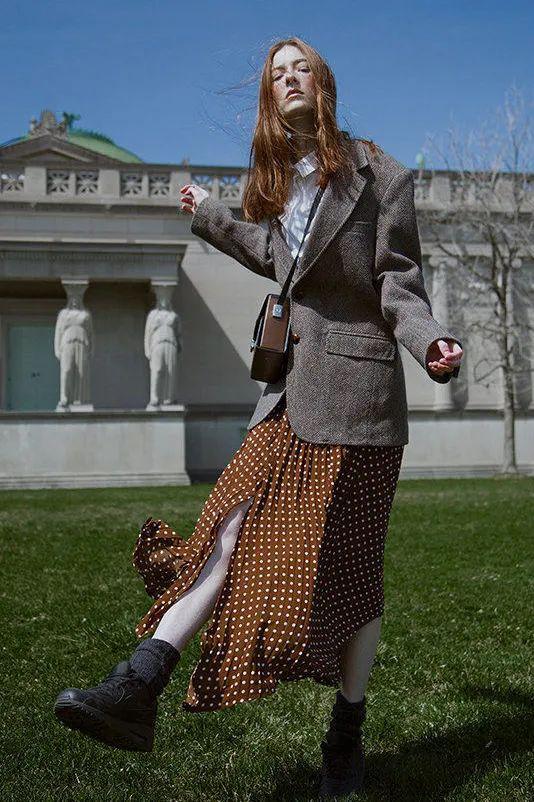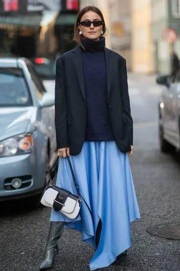 裙子不仅能中和外套的过分枯燥基础,还能为原本柔雅的穿搭增添些许飒A与洒脱之意。