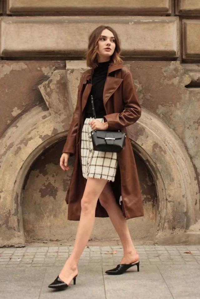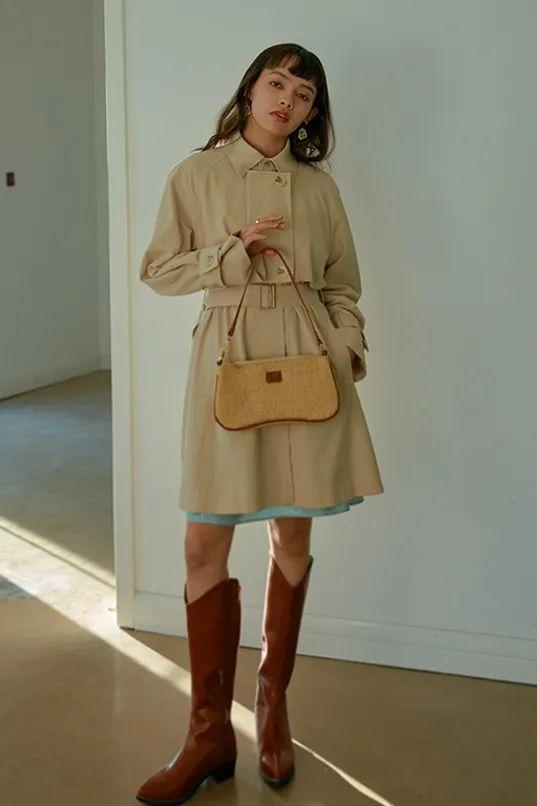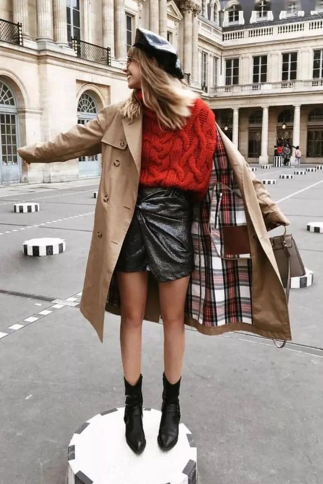 穿腻常规款,风衣+超短半裙亦是不错的选择,不仅能通过充分暴露双腿进而拉长腿部视觉比例。