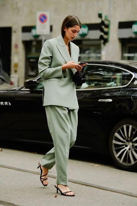 除了常规色,其实像明媚活力的绿色套装也是不错的选择,既迎合了春天的万物生长又同时将“优雅随性时髦”集于一身。