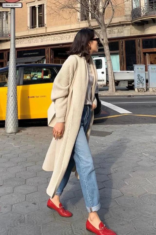 温暖且舒展的长款针织外套也是不错的选择,春天简单搭配9分裤+乐福鞋,不拘一格间也是养眼应景爆了。
