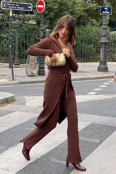 早春利用针织外套与T恤叠穿,下装选择自带显瘦滤镜的休闲西服呼应,刚柔并存的韵味显尽质感与不俗。