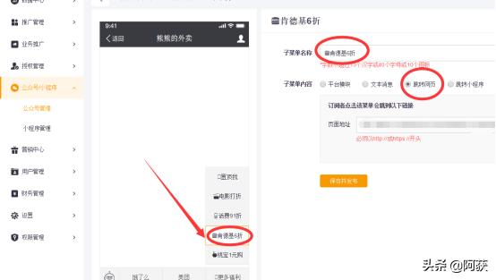 详情链接设置饿了么小程序 -输入小程序地址和备用网址 方法和设置菜单是一致的
