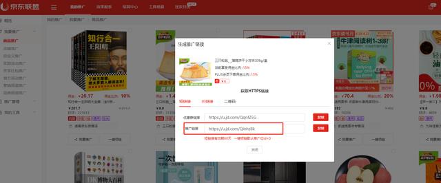 到京东联盟后台选择商品进行推广商品,生成推广链接。如图: