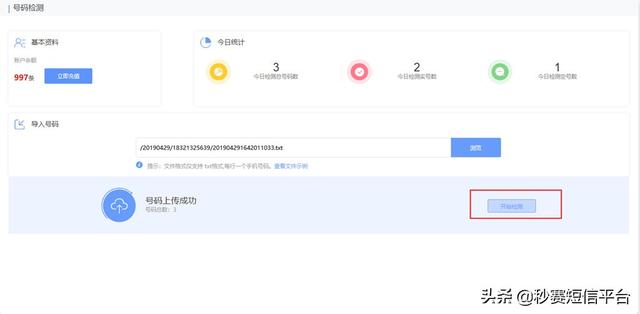 3、开始检测(号码上传成功后,点击“开始检测”)