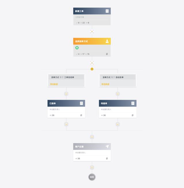 当售后客服部门创建工单提交后,系统可以按照企业预先搭建好的工单流程自动进行流转,分配给特定的部门或者员工,轻松搞定复杂的业务流程。