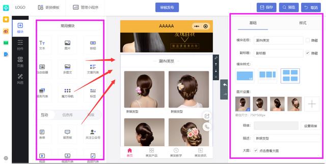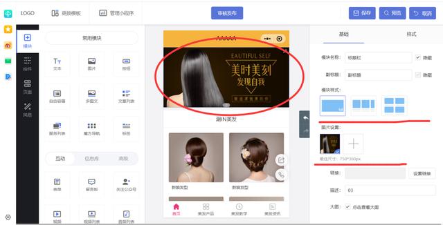 开始装修小程序页面内容,页面的文本,图片这些都可以选中以后直接更改和替换,还能自己添加空白模块组件,用来展示课你想要展示的内容到你的小程序中。