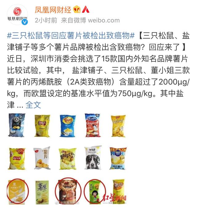 2020年10月29日,深圳市消费者委员会发布一份报告显示,在检测的15款国内外知名品牌薯片中,丙烯酰胺含量超过欧盟标准,且含量最高的品牌是盐津铺子、三只松鼠和董小姐三家。