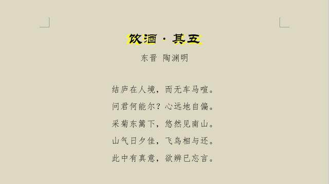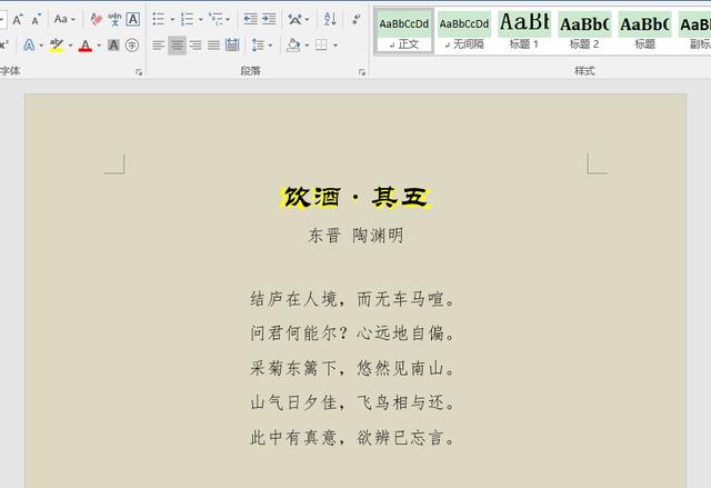 下图Word文档中输入了东晋文学家陶渊明的诗作《饮酒·其五》,其中第一行诗名《饮酒·其五》使用了黄色阴影文本效果进行突出显示。