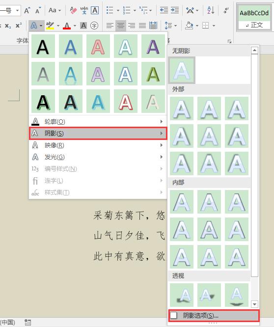 2、在[文本效果和版式]按钮下拉列表中选择[阴影],在级联菜单中单击下方的[阴影选项]。