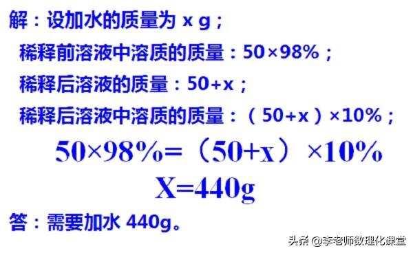 例题:把50g溶质质量分数为98%的浓硫酸溶液,稀释成质量分数为10%的稀硫酸溶液,需要加水多少克?