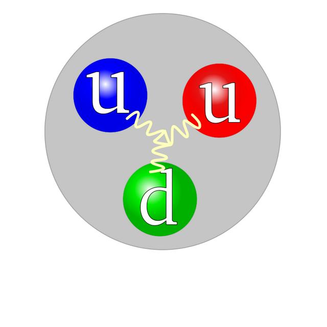 到目前为止,一切看起来都很好,但是我们还没有完全解决问题。现在我们知道,质子和中子不是基本粒子,它们由夸克组成。一个质子包含两个上夸克和一个下夸克,一个中子包含两个下夸克和一个上夸克。在这些较大粒子中则是通过胶子将夸克结合在一起。