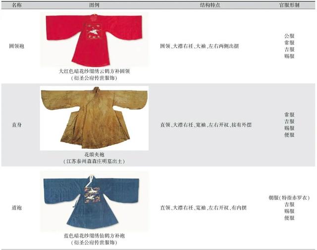 从服装整体结构上来看,文武官员服饰中较为常见的形制有圆领袍、直身、道袍、搭护、帖里、曳撒等,其结构样式、特点如表1所示。