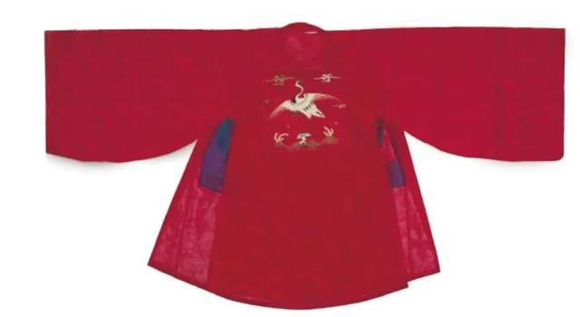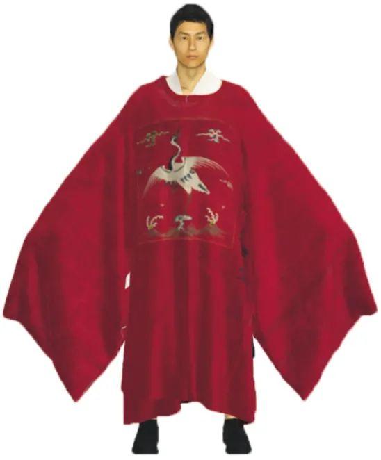 图11 大红色暗花纱缀绣云鹤方补圆领