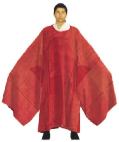 1)公服介绍。孔府所藏公服为大红素纱袍,如图8所示。圆领,大襟右祍,大袖,两侧有摆。该圆领袍身长135 cm,腰宽65 cm,两袖通长249 cm,袖宽72 cm[8]42。
