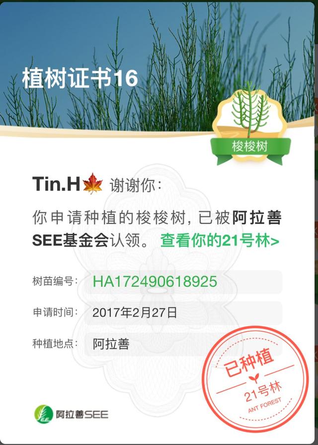 我第一次听说蚂蚁森林应该是在2017年的一个广告中看到的,从此开启了我的蚂蚁森林之路,终于,在2017年2月27日的阿拉善种下了属于我的第一棵梭梭树。