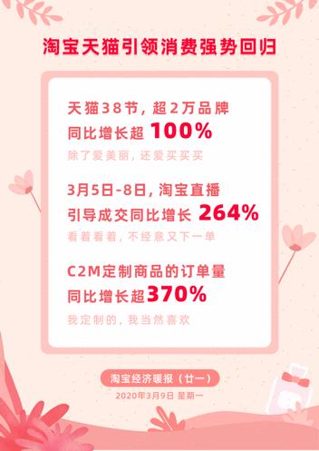 天猫官方数据显示,天猫38女王节整体销售额远超去年,超过2万个品牌销售额同比增长超过100%。产业带商家也在这次线上购物节中迎来新的销量增长点,总订单量超过4500万单,其中C2M定制商品的订单量同比增长370%。