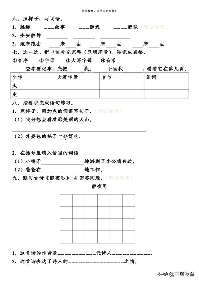 九、默写古诗《静夜思》,并回答问题。