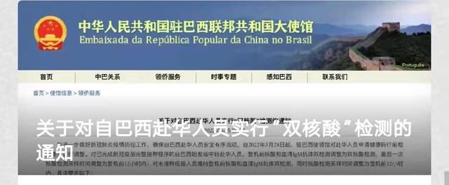 中国驻巴西大使馆:关于对自巴西赴华人员实行“双核酸”检测的通知