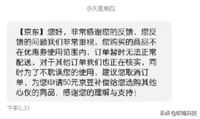 那么剩下没有发货的怎么办呢?京东补货之后依次发货?那是想太多了,在商言商,京东不会这样吃眼前亏的,对于没有发货的单子,京东挨个发短信或者在 App 给客户发信息,以下是相关短信截图页面: