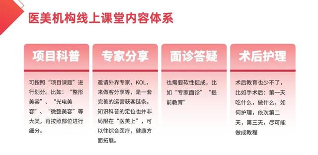 现在信息虽爆炸,但专业化内容并不多,每个医美机构针对项目都应该做相关“知识课堂”,对求美者进行知识的普及和教育。不过现在机构一般是咨询师直接告知客户,无法批量式教育公域客户。