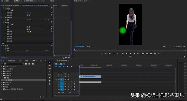 首先,我们就还是准备一段绿幕的素材,这个素材呢?,大家可以呢。有绿幕的、蓝幕的或者说纯色的背景的都是可以的,然后放到时间线之后呢,直接在效果里搜索超级键,然后在这里我们直接打【超级】两个字,就会出现我们超级键的一个效果,图片然后把它直接拖拽到这个素材之上,接着就会在我们效果控件中出现我们超级键的相关的一个参数。在正式的抠像之前给大家说明一点的就是,如果说你导的这个素材,或说你拍摄这个素材光线比较均匀,背景比较干净的话,那我们利用吸管工具,基本上一键就可以抠取。这里我们利用吸管工具试一下,大家注意看,当我利用吸管工具吸取我们视频中的的绿色的时候,我们整个绿色就已经被吸干净了。