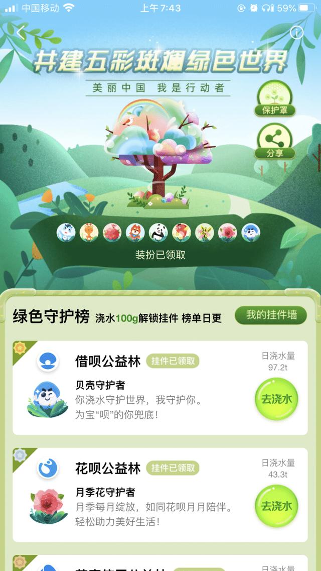 在这之前,支付宝的蚂蚁森林还上线了五彩斑斓主树皮肤的活动。参加方法为:2020年6月日到2020年6月20日,点击蚂蚁森林左上角的活动标志进入,每个公益品牌浇水100g,可以活动专属挂件,一共9个品牌,全部兑换完成需要900g,主树皮肤有效期为2020年07月31日。是否划算,看个人的意愿了。毕竟,不是所有人能像本兎一样,一天能偷1000g+的。