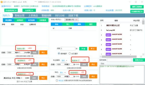 记者购买安装该软件并绑定其中一家淘宝直播店铺后,记者在其后台发现,可批量点赞、购物、关注、“来了”、观看,可设置需要的总数及间隔时间,启动服务后页面会用红色小字体显示已增加的服务单项数量。