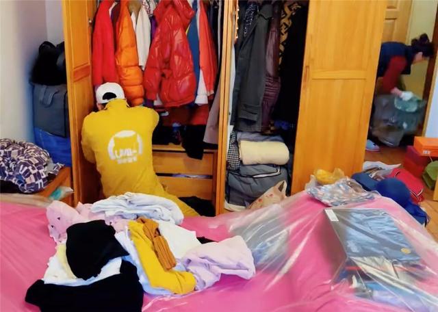卧室除了有些脏以外,衣柜中的诸多衣物也是个问题,几位保洁师将衣柜全部清空,衣服掏出后,叠放归类整齐再收入其中,井井有条。