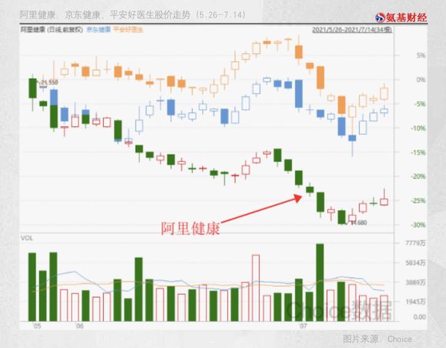 前者跌幅远高于后者,一方面与京东健康的新股身份不无关系,另一方面,则更多是因为阿里健康业绩不及预期。