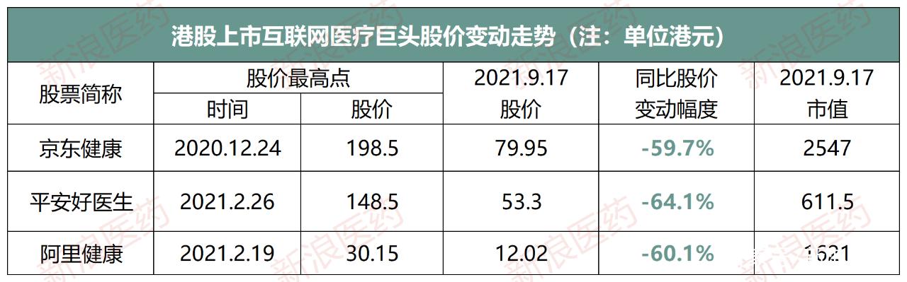 截至2021年9月17日,京东健康、阿里健康、平安好医生三巨头距离股价最高点平均跌幅已超60%,而第N次启动上市计划的微医还迟迟没有跑入资本市场,零氪科技更是在赴美上市前夕紧急喊停,叮当快药上市行动未见进展,医联甚至还在今年6月联系新浪医药直接否认盛传的“IPO计划”。