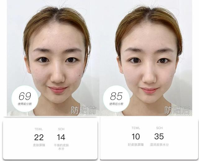 03 @八豆:防晒后进入“好皮肤屏障”,TEWL数据改善高达9,同时皮肤水分大幅提高(SCH+13)。并且视觉上肤色提亮明显,不泛油光,皮肤变得更加细腻。