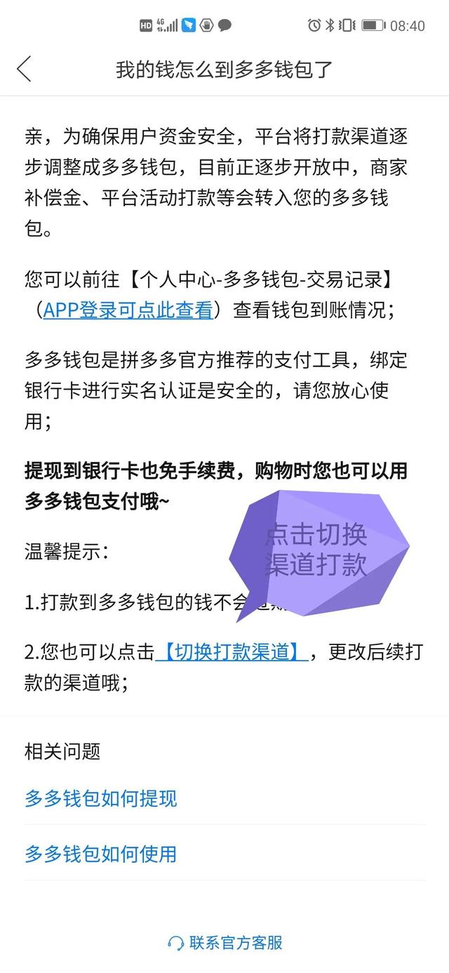 最近多多商家苦多多钱包久也,给客户小额返款退运费险老是退到多多钱包里,很多客户不会开通钱包或者不愿开通就会一直和你纠结,有的还会辱骂客服弄的大家苦不堪言,还有很多人直接给你差评,或者让你重新打款,你又无法引导到微信或者支付宝里这样会被处罚今天给大推荐一个解决办法看看下图按这个顺序来弄一定可以解决很多麻烦:1、打拼多多A pp找到个人中心。2,点击多多客服。3、找到多多钱包。4、点击我的钱怎么到多多钱包里去了。5、找到图片标识的蓝色字点击切换打款渠道。6、然后点击切换就可以完成切换了。这样我们客服就不会那么苦了。不过这里还要提醒大家多多到处都是坑在引导客户时注意引导用话术,不然又被处罚的,还有封店的危险那就不好玩了。