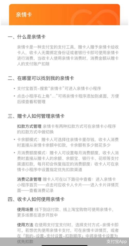 记者注意到,亲情卡是支付宝推出的支付工具,赠卡人赠与亲情卡给收卡人,收卡人无需绑定身份证或者银行卡就可以用亲情卡进行消费,当收卡人使用亲情卡消费时,消费金融直接在赠卡人支付账户中扣除。