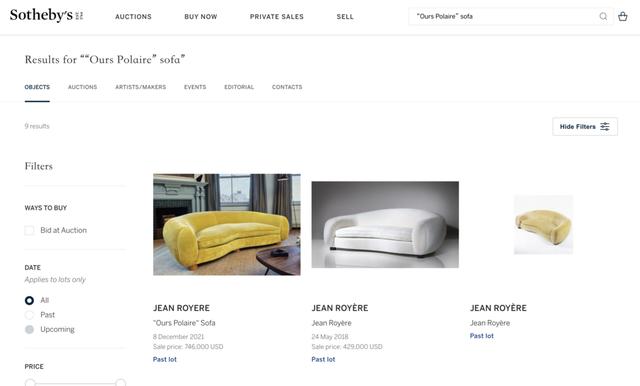 在2021年12月8日的苏富比拍卖上,让Kanye爱到发狂的同款黄色Ours Polaire沙发拍到74.6万美元(约合473万元人民币)。