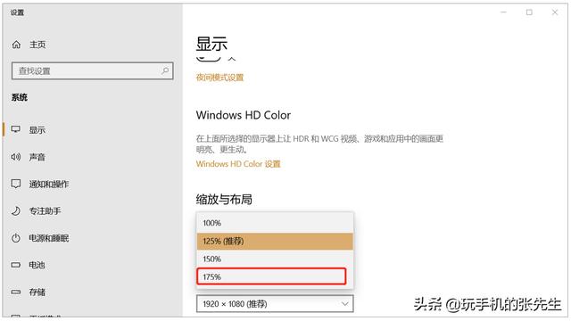 3、在列表框中选择“175%”,便可将当前系统中显示的文字及图标放大1.75倍。