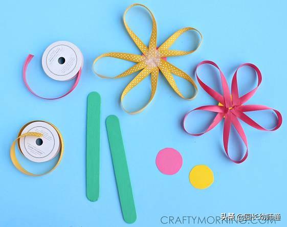 用卡纸剪出4个小圆圈做花心;切割5条相同长度的丝带,循环一圈粘到圆圈上做花瓣,一朵花五朵花瓣,最后在背面粘上绿色的冰糕棍做花茎,丝带花完成了!