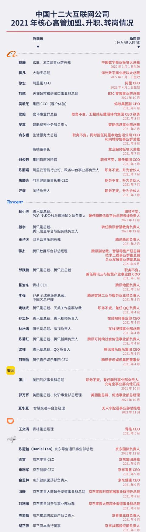 《财经》盘点了 2021 年这些公司核心高管的流动情况,核心管理层作为一家企业的决策中枢,他们的变动在一定程度上也影响着企业的未来走向。