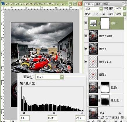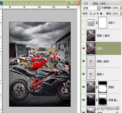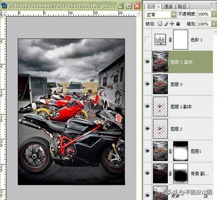 讲解:在Lab色彩模式下,对亮度层操作,将只改变图像的明暗度而对色彩不造成影响。这一步主要目的是压暗云层。加蒙版、擦除,是为了让前景(摩托车)不被压暗。