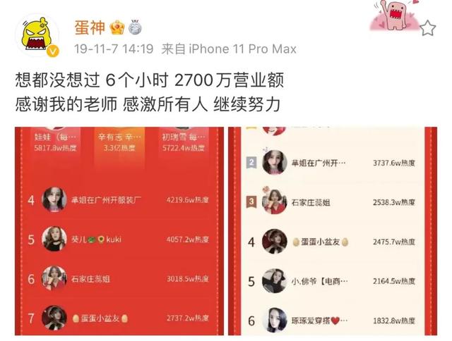 蛋蛋一次次打破自己的直播纪录,从挑战破亿的3.2亿到直播一周年的6.5亿。现在,她还有一个纪录等着超越,那就是辛巴。
