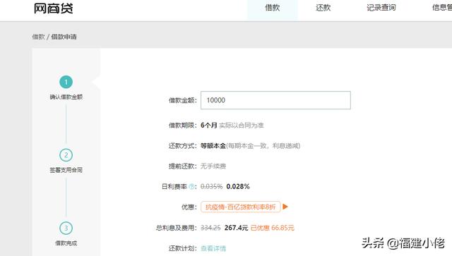 第四步:申请你要贷款的金额,提前还款,可以免收多余的利息,比如贷款10000万,6个月利息,目前只要267.4元
