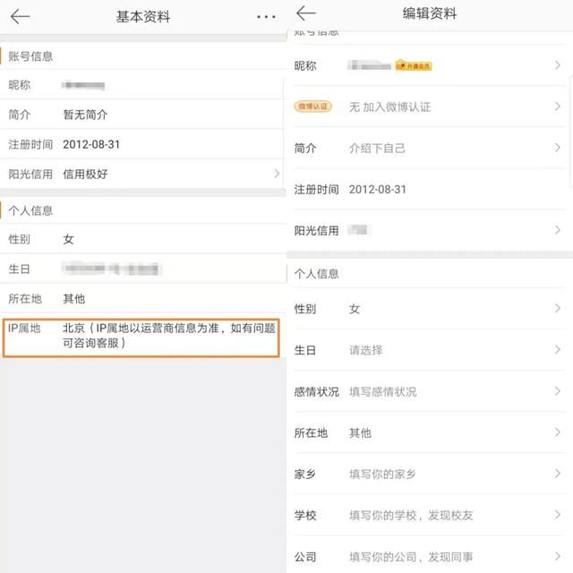 (左)使用他人账号来查看本人的微博资料页面。(右)自行查看本人的资料页面则看不到IP属地。