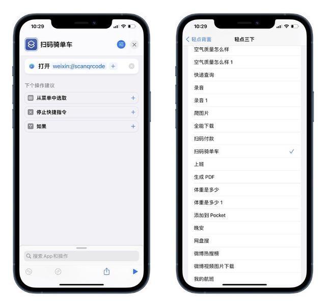 比如我每天要骑共享单车通勤,我就先在快捷指令里添加微信扫码的 URL 路径(weixin://scanqrcode),然后设置轻点三下唤醒该快捷指令,便可实现三击进入微信扫码界面了。