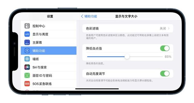 这时,你可以在辅助功能中,找到「降低白点值」,打开并滑动降低亮色的强度,直到你感觉舒服为止。