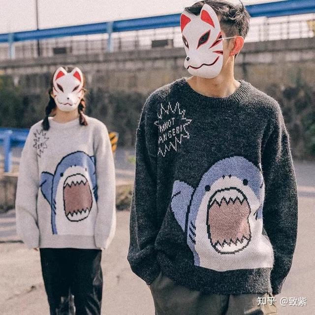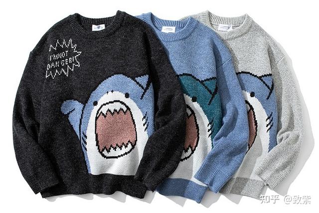 卡通大鲨鱼,潮流感up。秋日里,用毛衣传递温暖是个不错的主意。