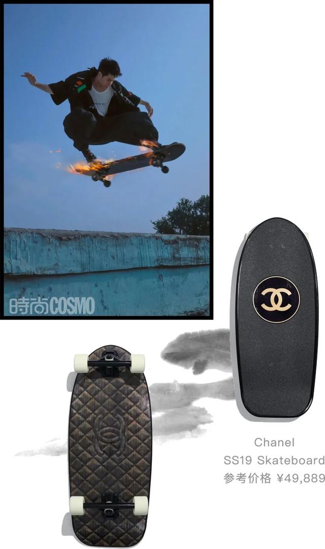 但你知道,他的也来自Chanel吗?内页中,这个贴有5号贴纸的透明滑板不确定(可能只是道具),但上脚滑的这款是来自Chanel 2019SS。