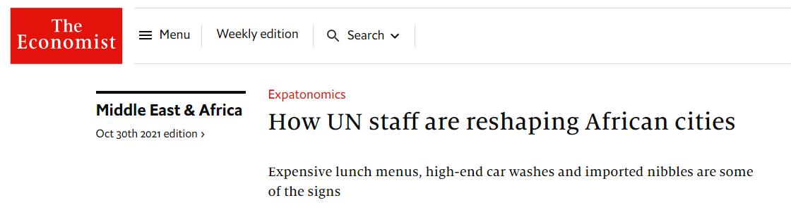 10月30日,英国亲自由主义刊物《经济学人》在文章《联合国员工如何重塑非洲城市:昂贵的午餐菜单、高端洗车店和进口零食是其中一些标志》中,对联合国非洲驻地附近的经济现象做出了如上描绘。