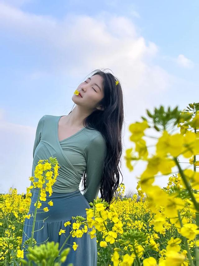 利用前景的油菜花田作为前景,人物放置花面中心,增加了画面的丰富度和层次感,最好选择蓝天作为背景突出主体人物的情绪表达。