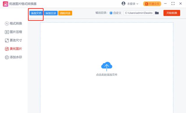 步骤1:先下载安装“优速图片格式转换器”软件然后打开,点击【添加文件】按钮,将需要批量操作的图片导入。