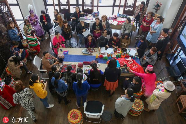 现在,她的作品已经用上了贵州的刺绣,新疆的绳结艺术,还有侗族的植物染……图为全国各地的非遗代表和加佳共同分享制作娃衣经验。(图片署名: 东方IC)